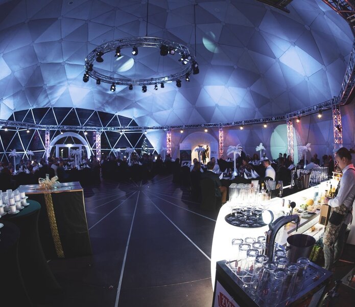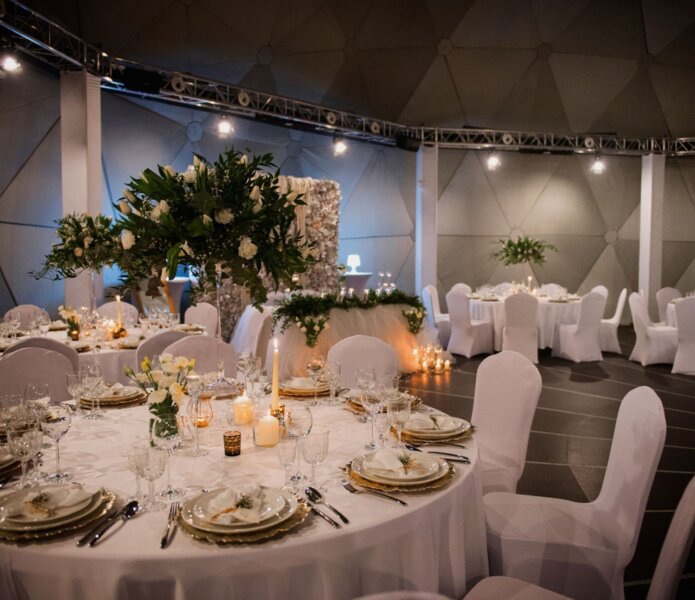 Neobvyklý svatební sál (200 m2) s profesionálním zvukovým systémem, scénou a moderním osvětlovacím systémem je umístěn pod slavnou sférickou kopulí. Uspořádání místnosti je přizpůsobeno očekáváním Novomanželů – ve variantě "podkova" zaručuje až 130 míst a v "banketové" variantě až 150.
