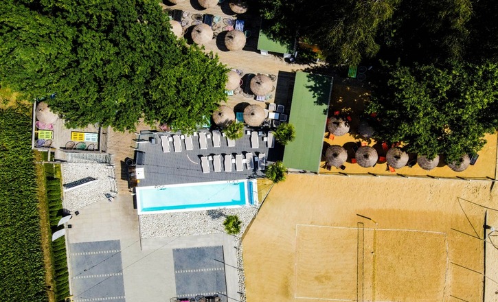 Relax in top style on a modern beach equipped with comfortable sun loungers and a refreshing pool.