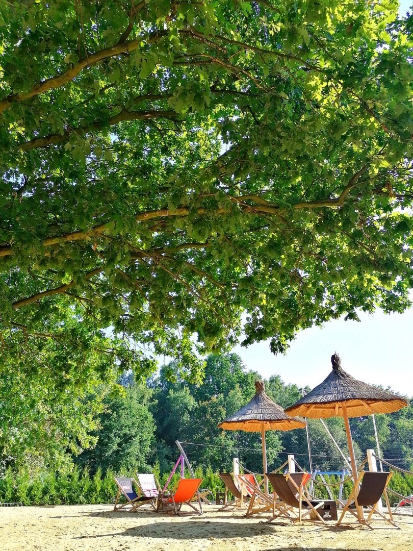 Piaszczysta strefa plażowa z drewnianymi leżakami i słomianymi parasolami pod rozłożystym drzewem, zielony las w tle.