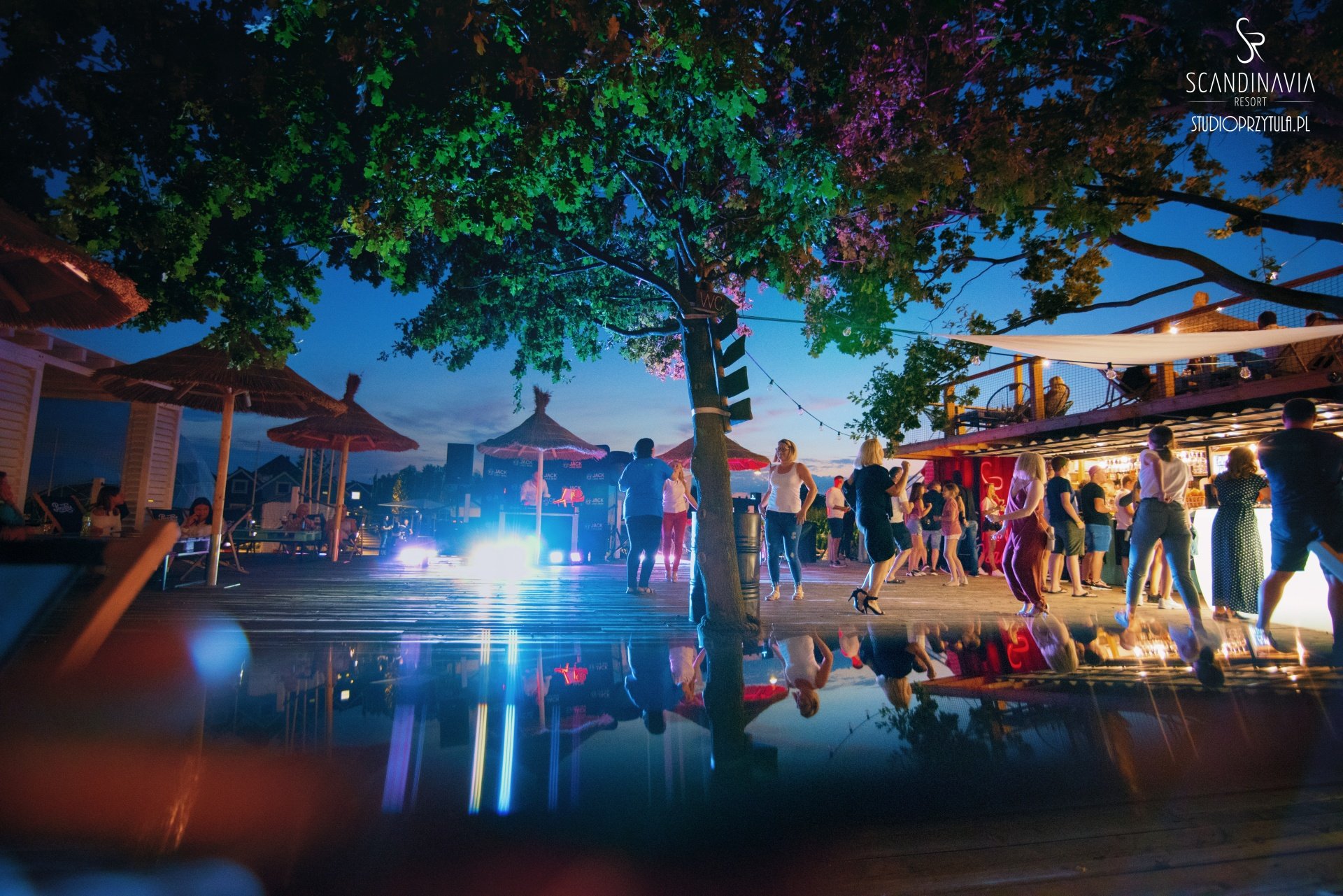 Wieczorny bar przy basenie w resorcie: goście tańczą pod podświetlonym drzewem, słomiane parasole, lampki i odbicia w wodzie.