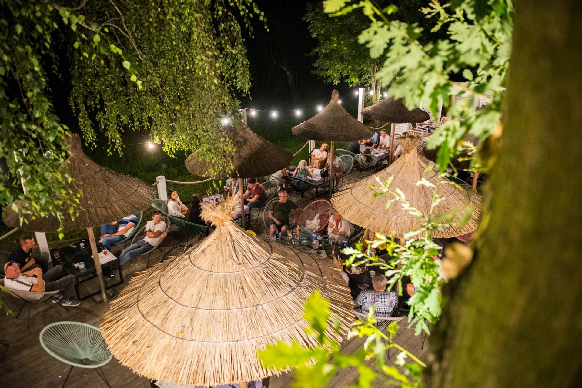Hotelowy taras nocą z trzcinowymi parasolami, lampkami, wygodnymi fotelami i gośćmi relaksującymi się przy stolikach
