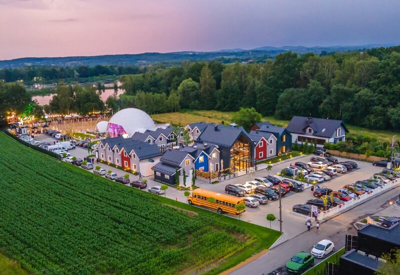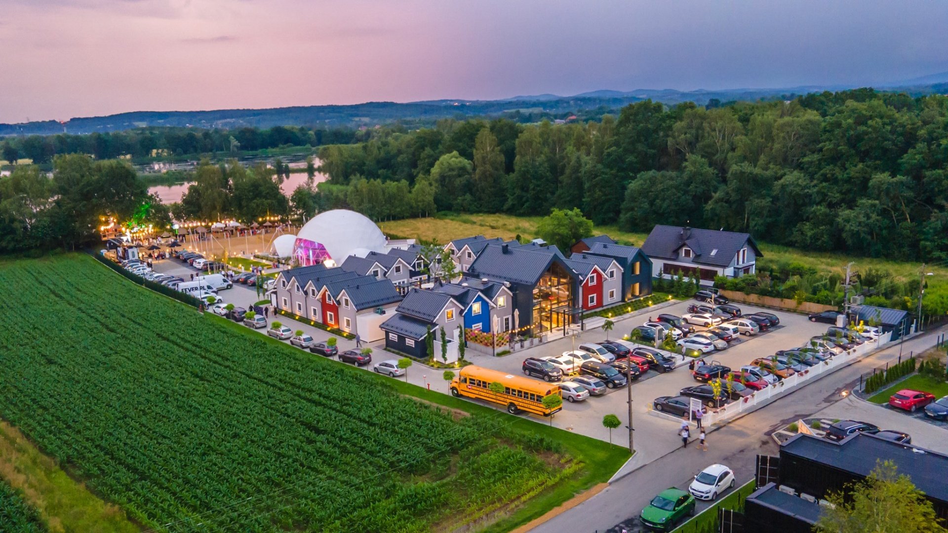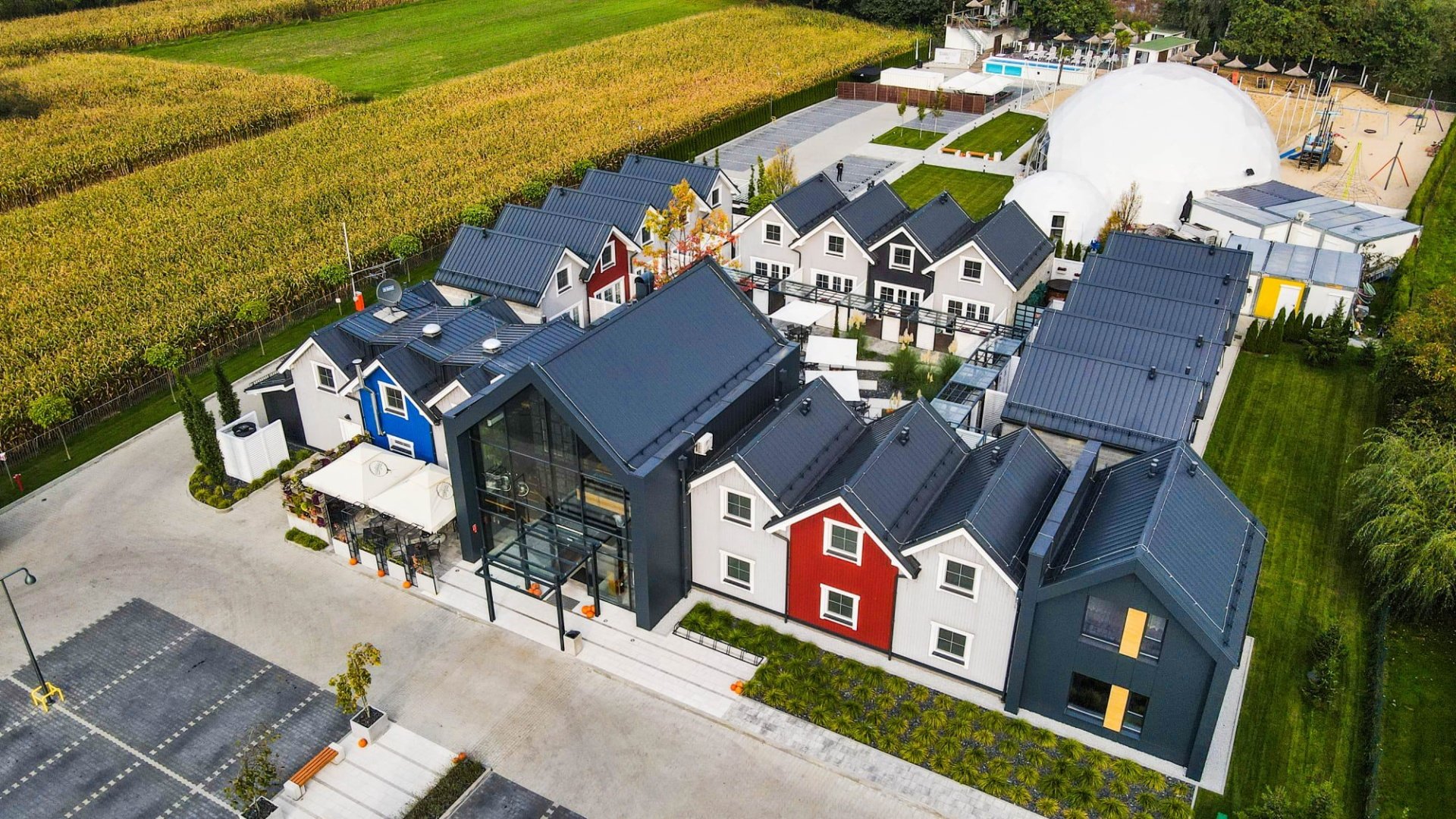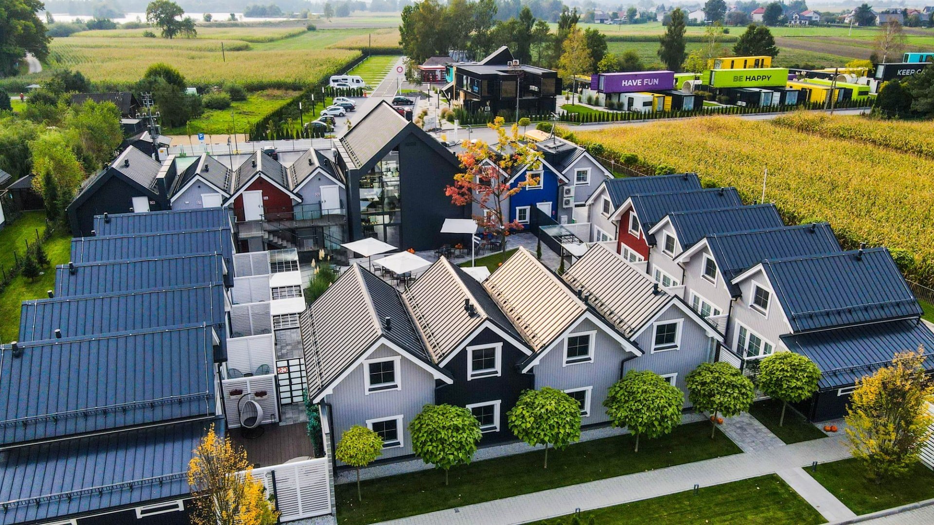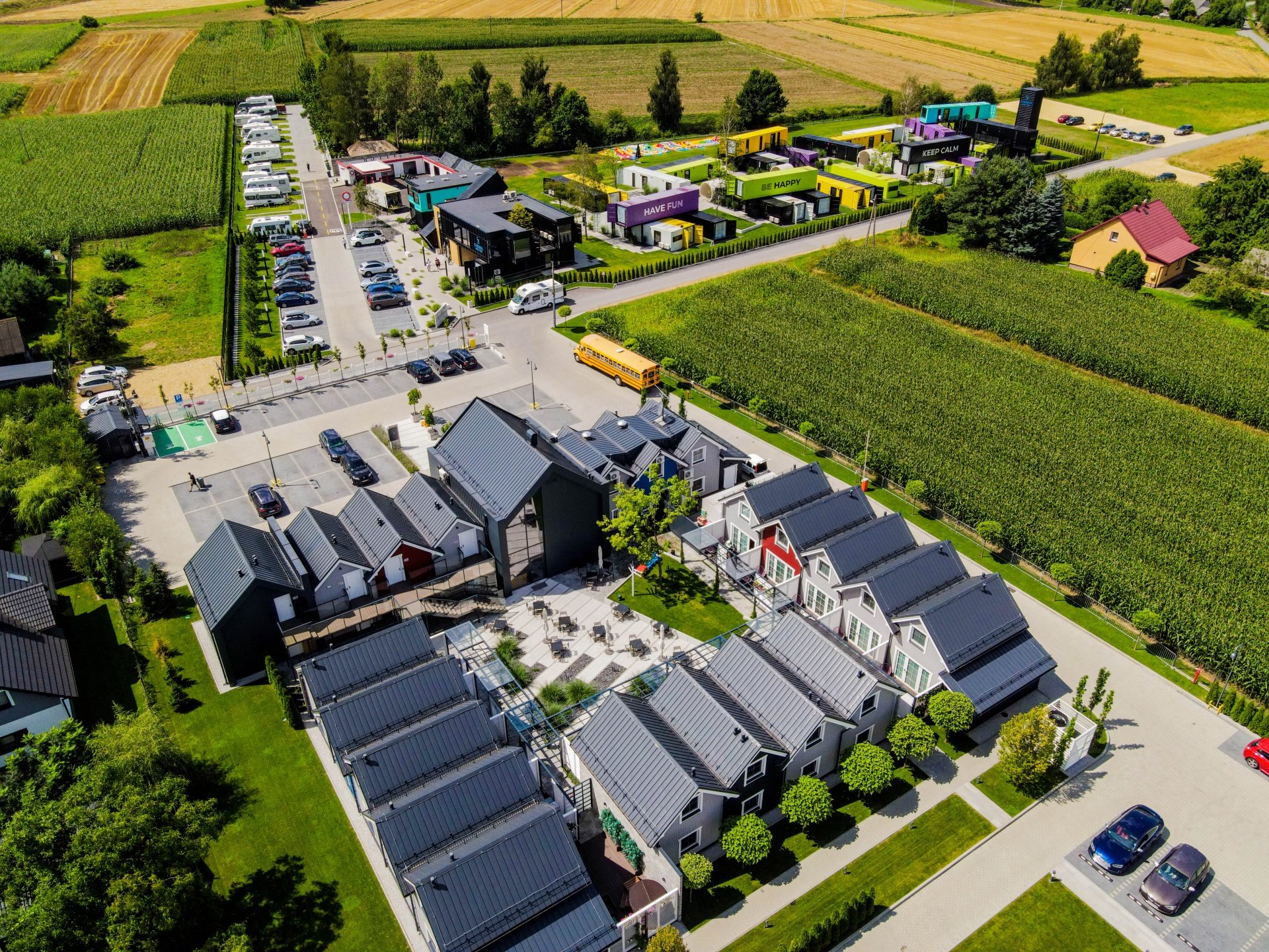 Nowoczesny ośrodek z lotu ptaka: rzędy domków z szarymi dachami, patio zewnętrzne z miejscami do siedzenia, parking i kolorowe moduły przy polach kukurydzy