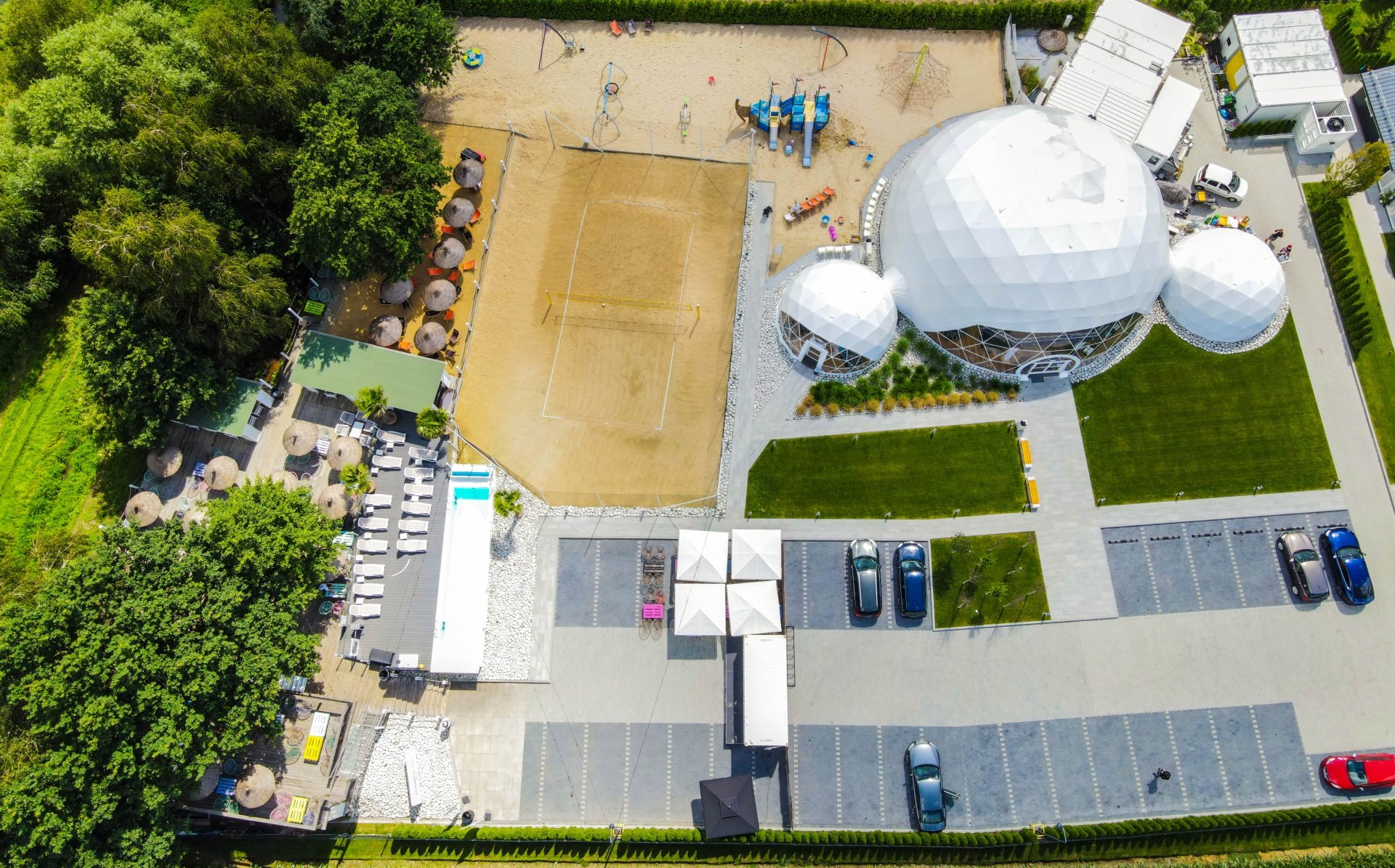 Biała kopuła geodezyjna jako przestrzeń eventowa przy piaszczystym boisku do siatkówki plażowej, taras z leżakami i parasolami, plac zabaw i parking
