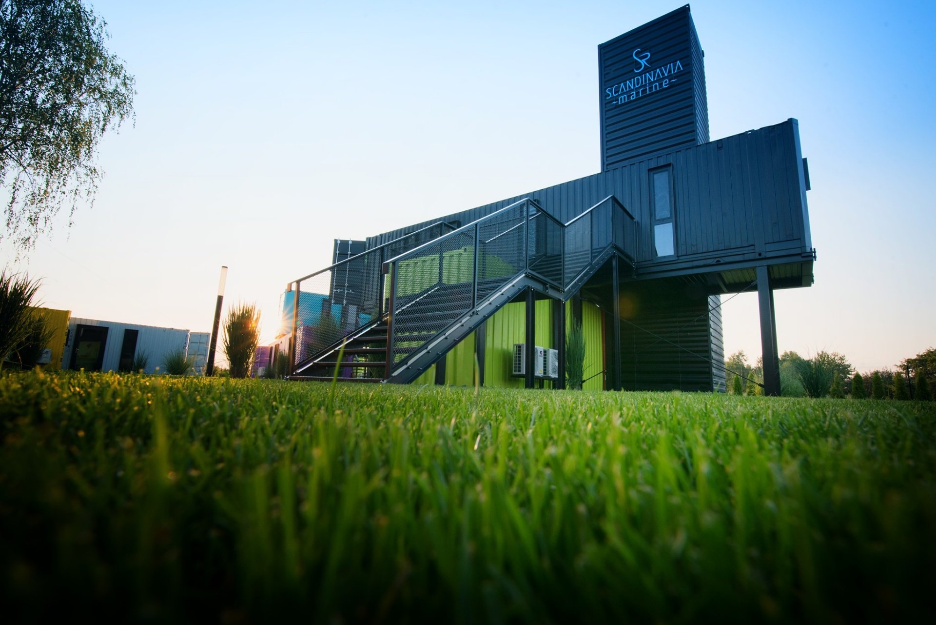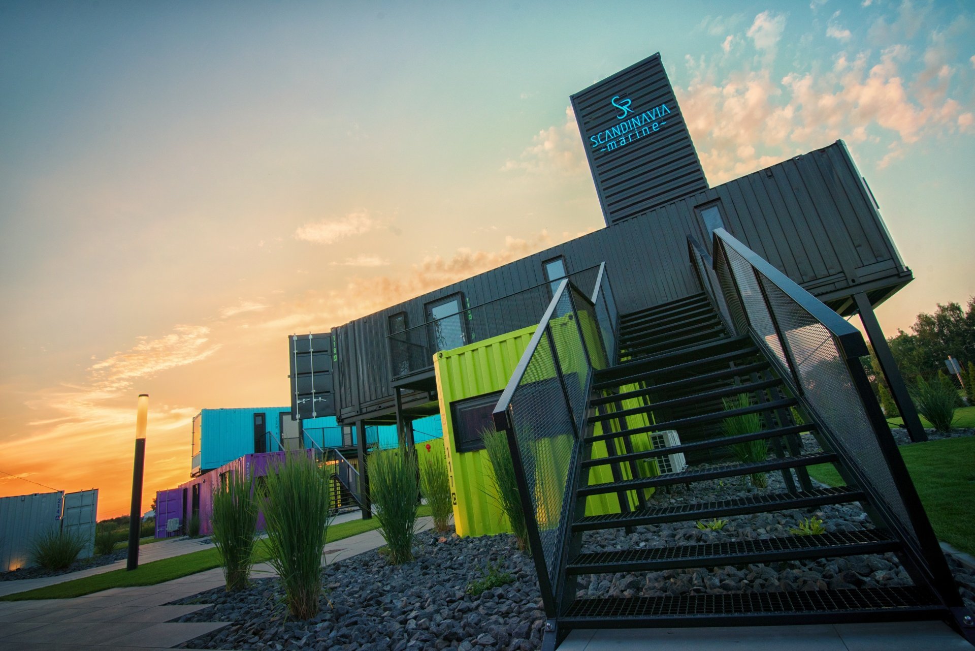 Kolorowy hotel z kontenerów z metalowymi schodami, kamienne rabaty i trawy przy zachodzie słońca pod napisem 'Scandinavia Marine'
