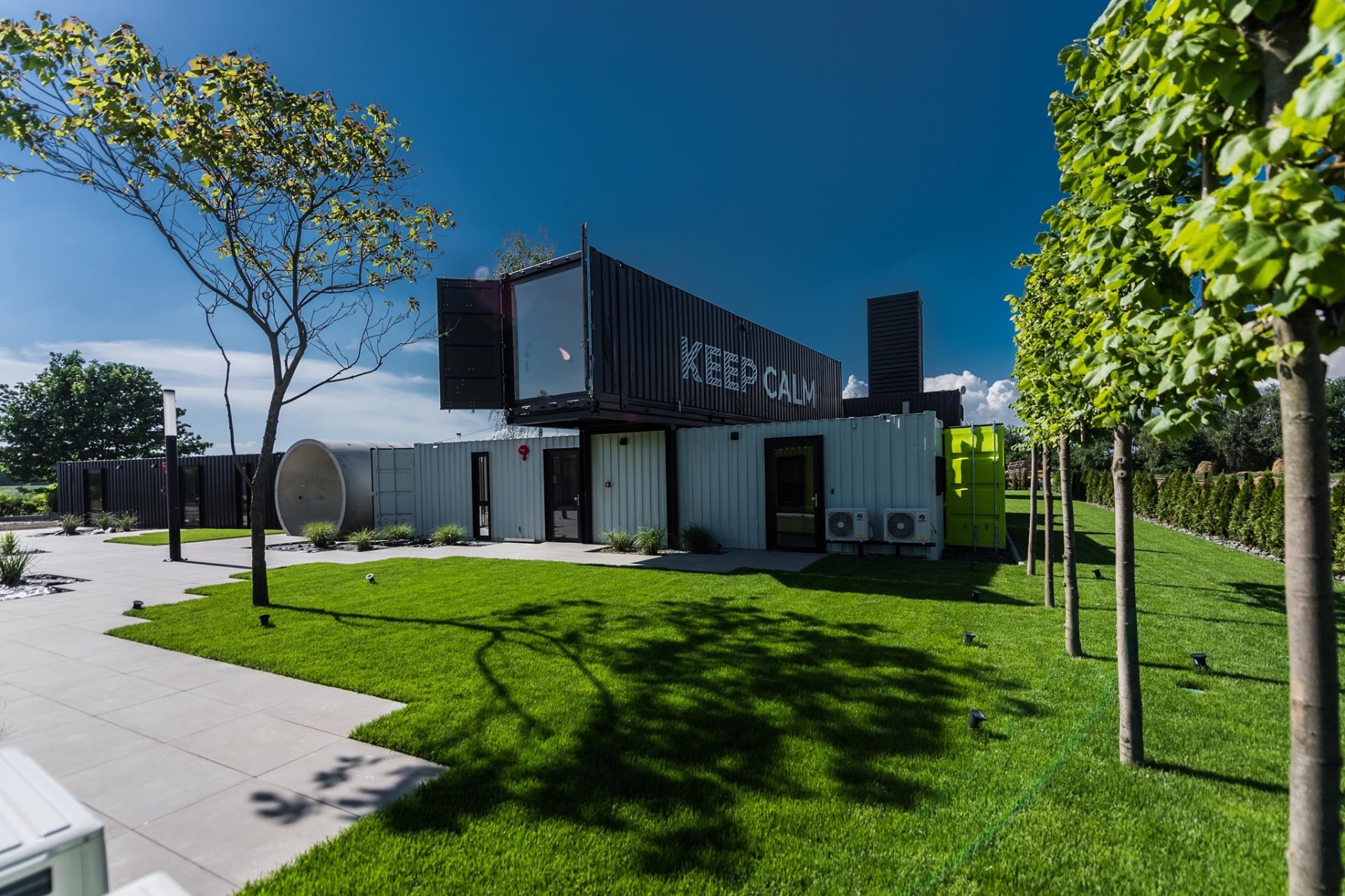 Budynek z nałożonych kontenerów z napisem „KEEP CALM”, taras z płyt, zadbany trawnik, młode drzewa i zewnętrzne klimatyzatory