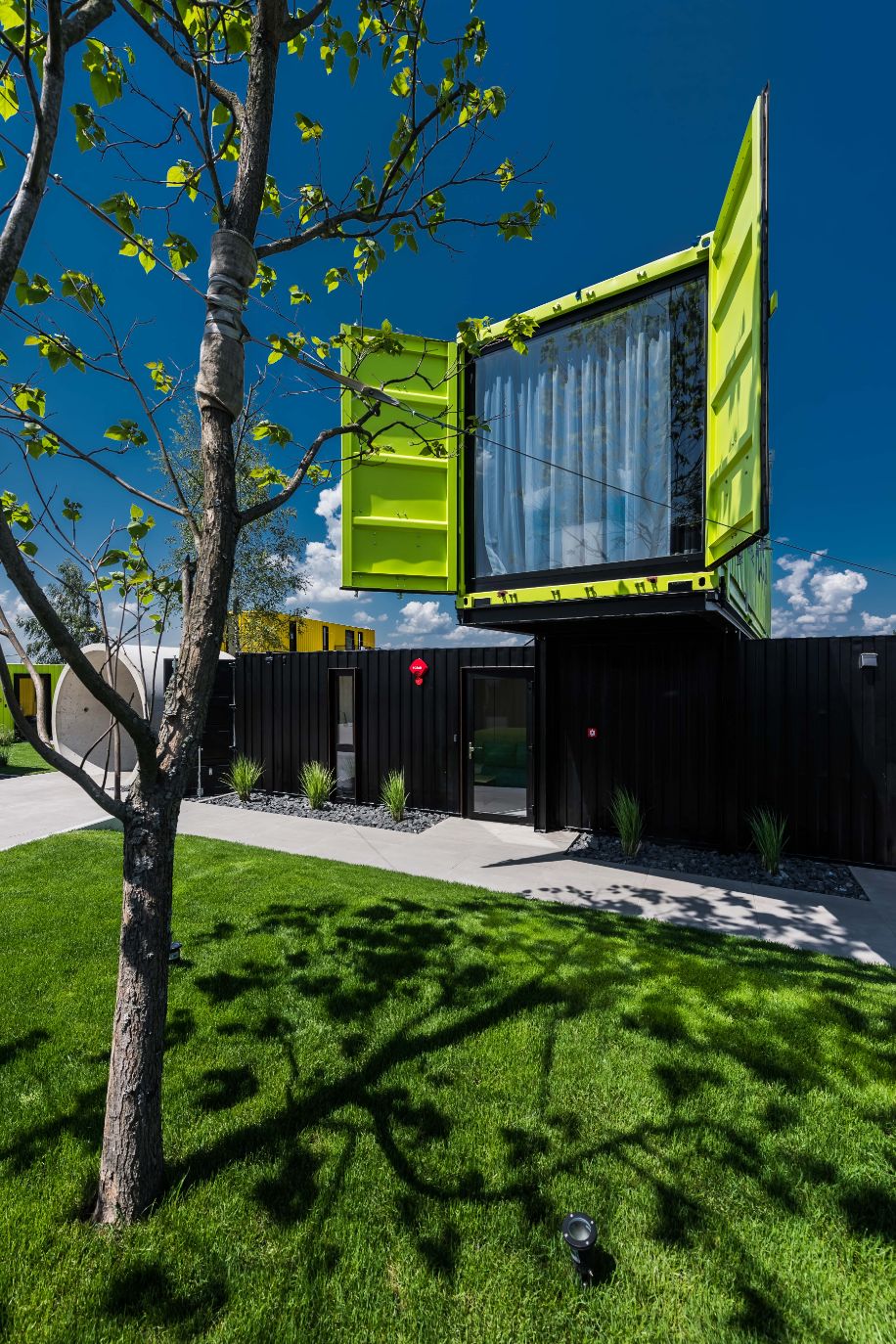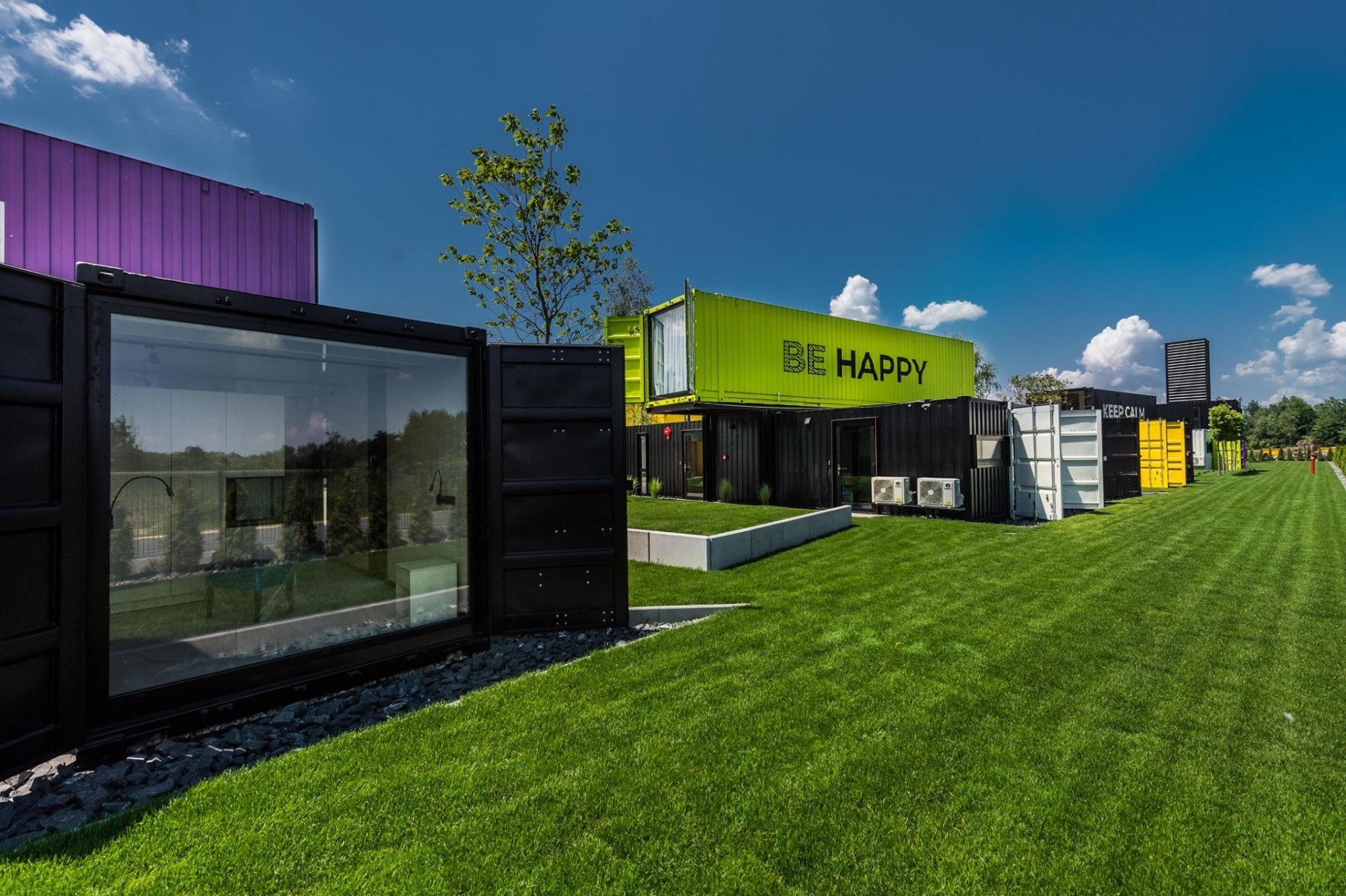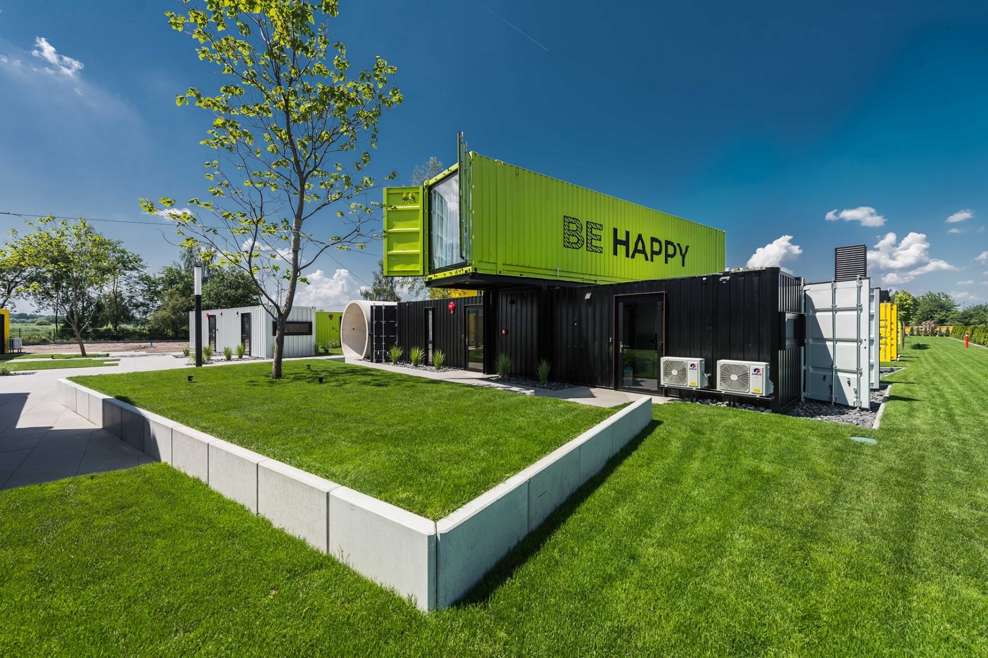Modułowy hotel z kontenerów: jaskrawozielony pawilon „BE HAPPY” na czarnych modułach, zadbany trawnik i dziedziniec pod błękitnym niebem