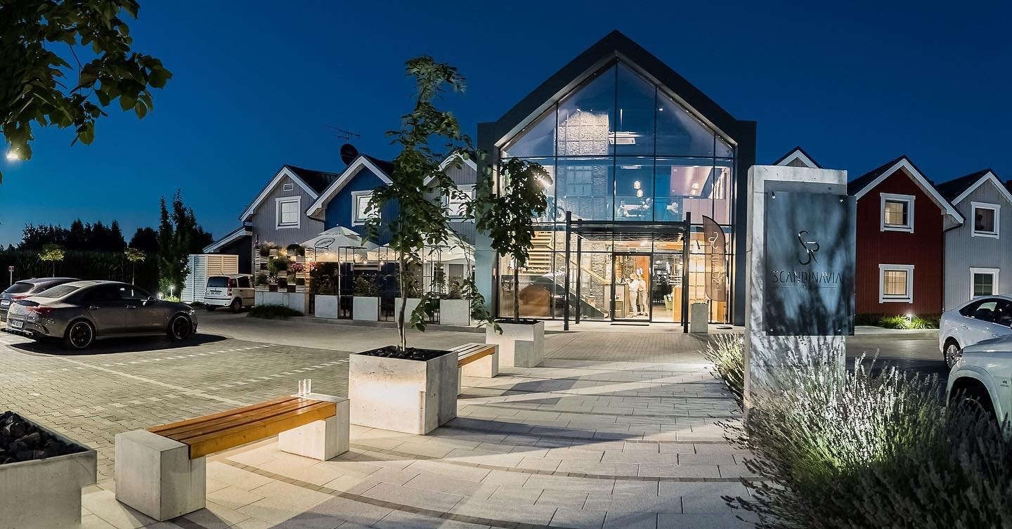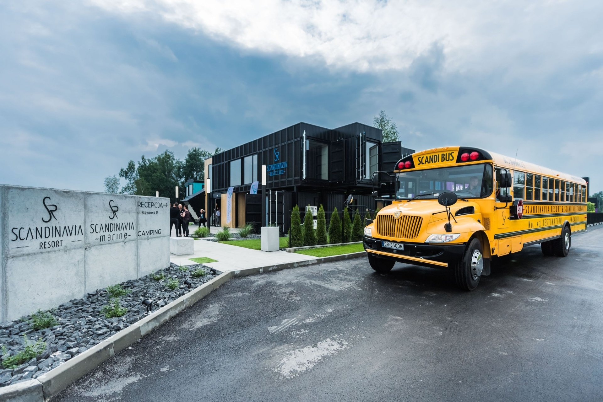 Nowoczesna czarna modułowa recepcja Scandinavia Resort, zadbane wejście i żółty autobus Scandi zaparkowany przy chodniku.