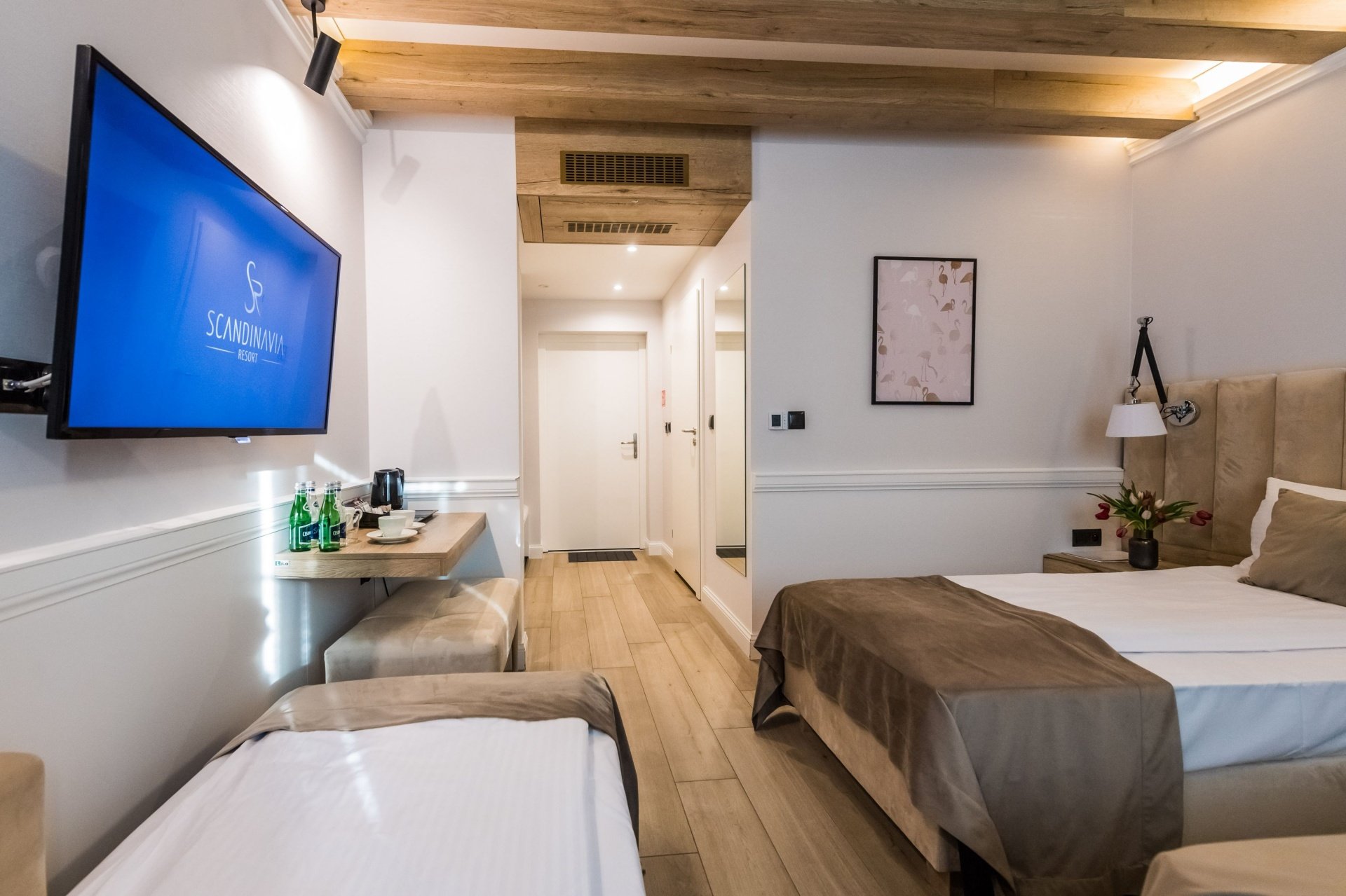 Jasny, nowoczesny pokój hotelowy z dwoma łóżkami, odkrytymi drewnianymi belkami, telewizorem, czajnikiem i butelkowaną wodą.