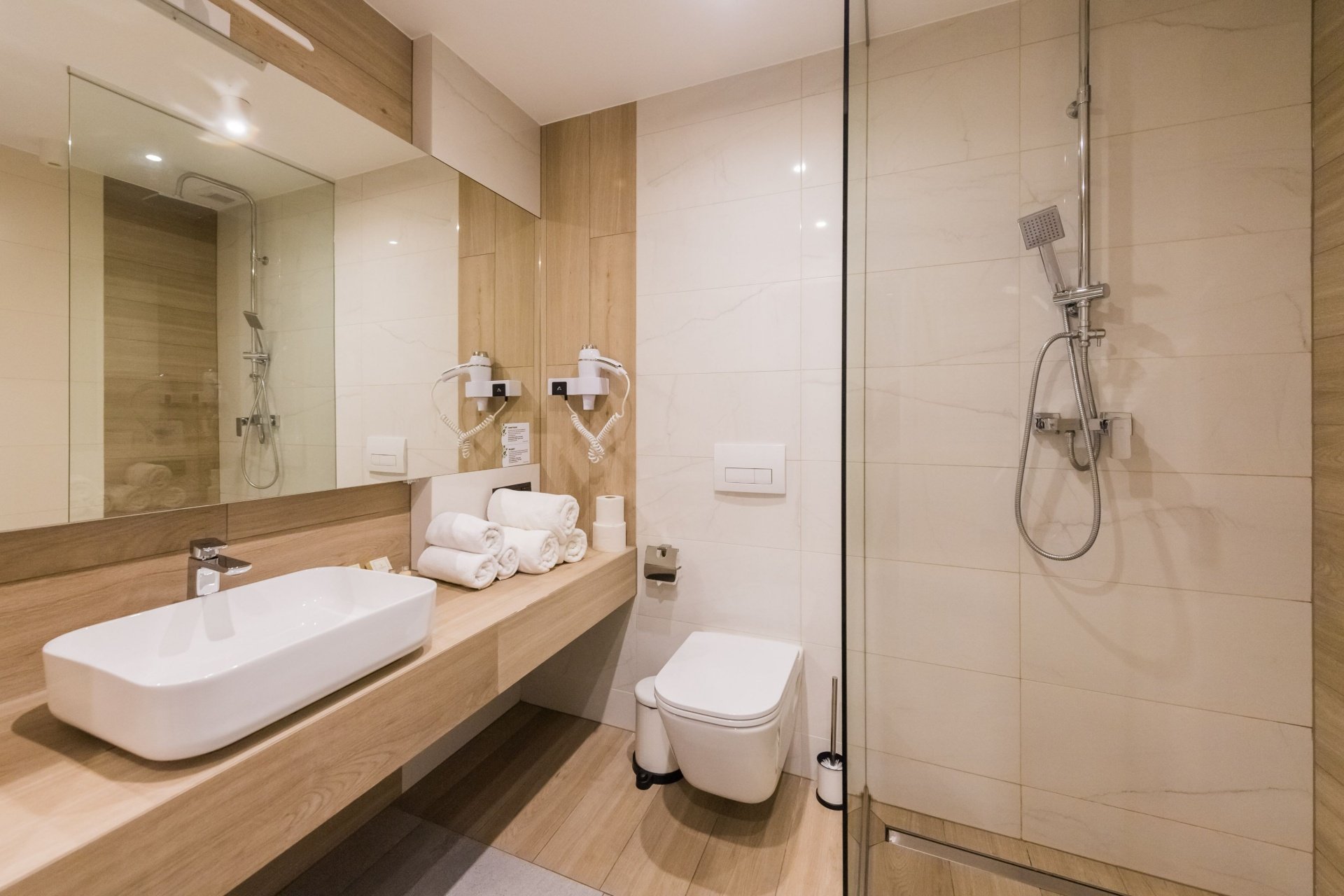 Nowoczesna łazienka hotelowa z drewnianą półką, dużą prostokątną umywalką, zwiniętymi ręcznikami, suszarkami i prysznicem z deszczownicą