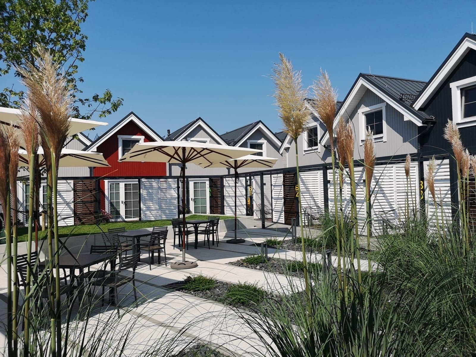 Słoneczne patio z parasolami, stolikami, ozdobnymi trawami i nowoczesnymi czerwono‑szarymi domkami z prywatnymi tarasami.