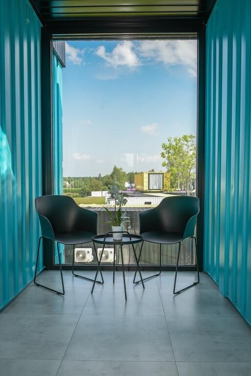 Dwa nowoczesne czarne fotele i stolik z rośliną przy panoramicznym oknie w turkusowym kontenerze, widok na wieś.
