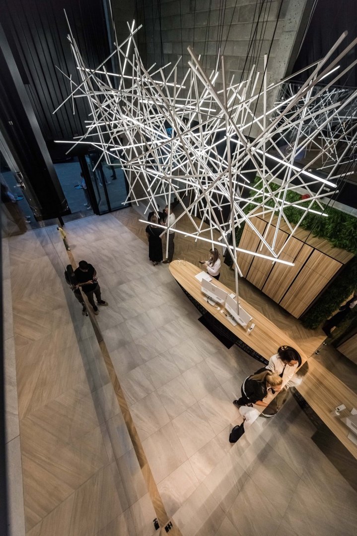 Nowoczesne lobby z geometryczną instalacją świetlną nad zaokrągloną recepcją, marmurową podłogą, zielenią i gośćmi.