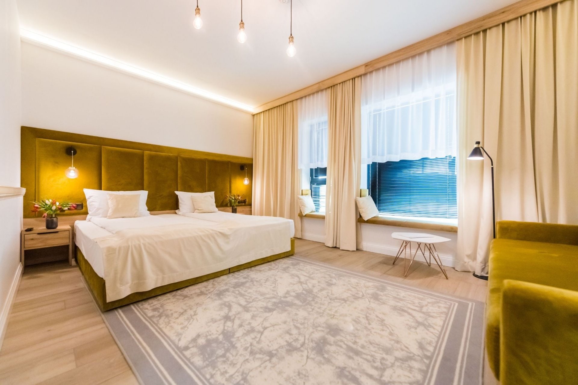 Nowoczesny pokój hotelowy z oliwkowym welurowym zagłówkiem, dwoma łóżkami, lampami wiszącymi, siedziskiem przy oknie i sofą