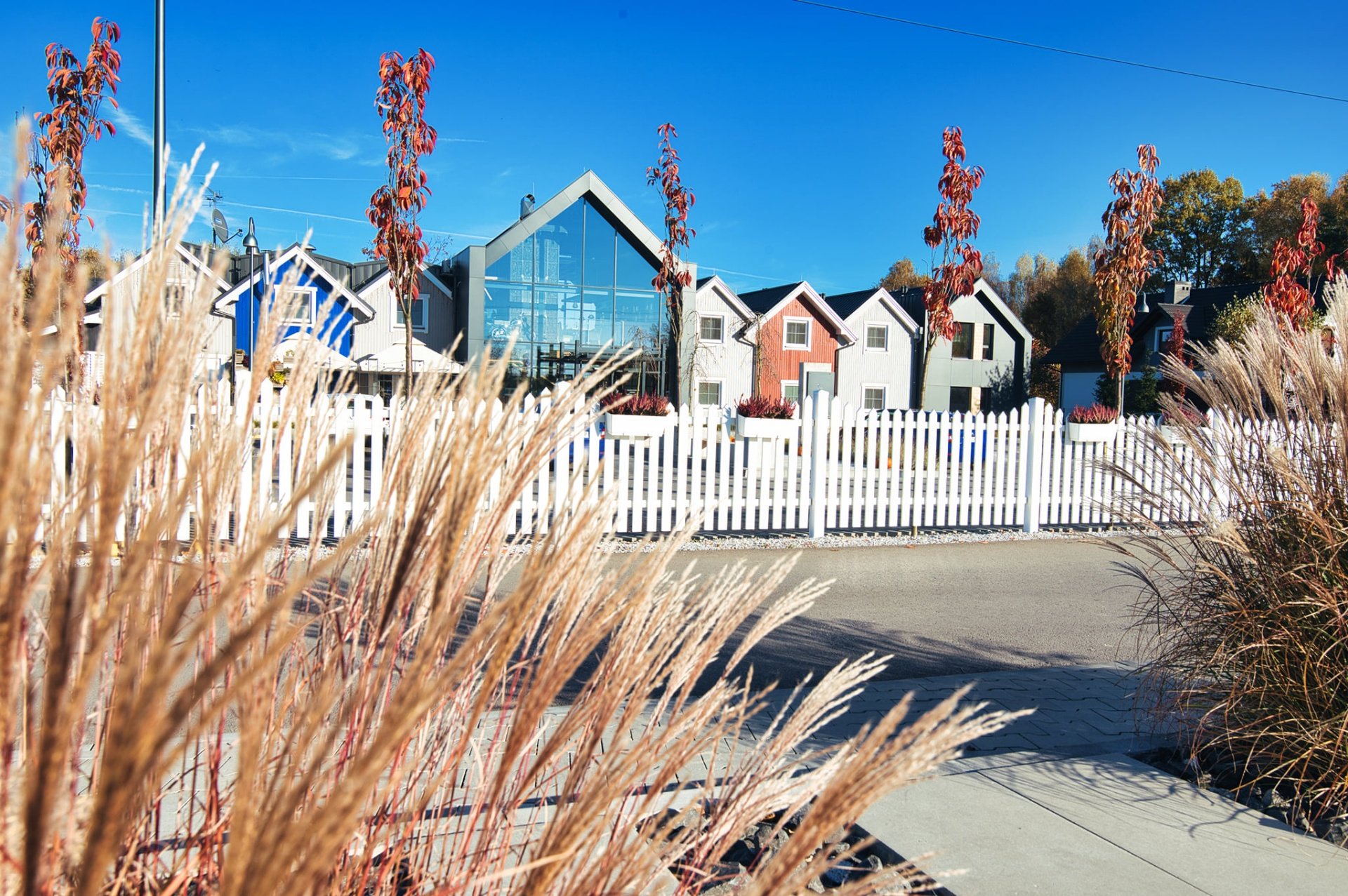 Butikowy hotel z przeszklonym lobby i kolorowymi domkami za białym płotem, ozdobne trawy i jesienne drzewa.