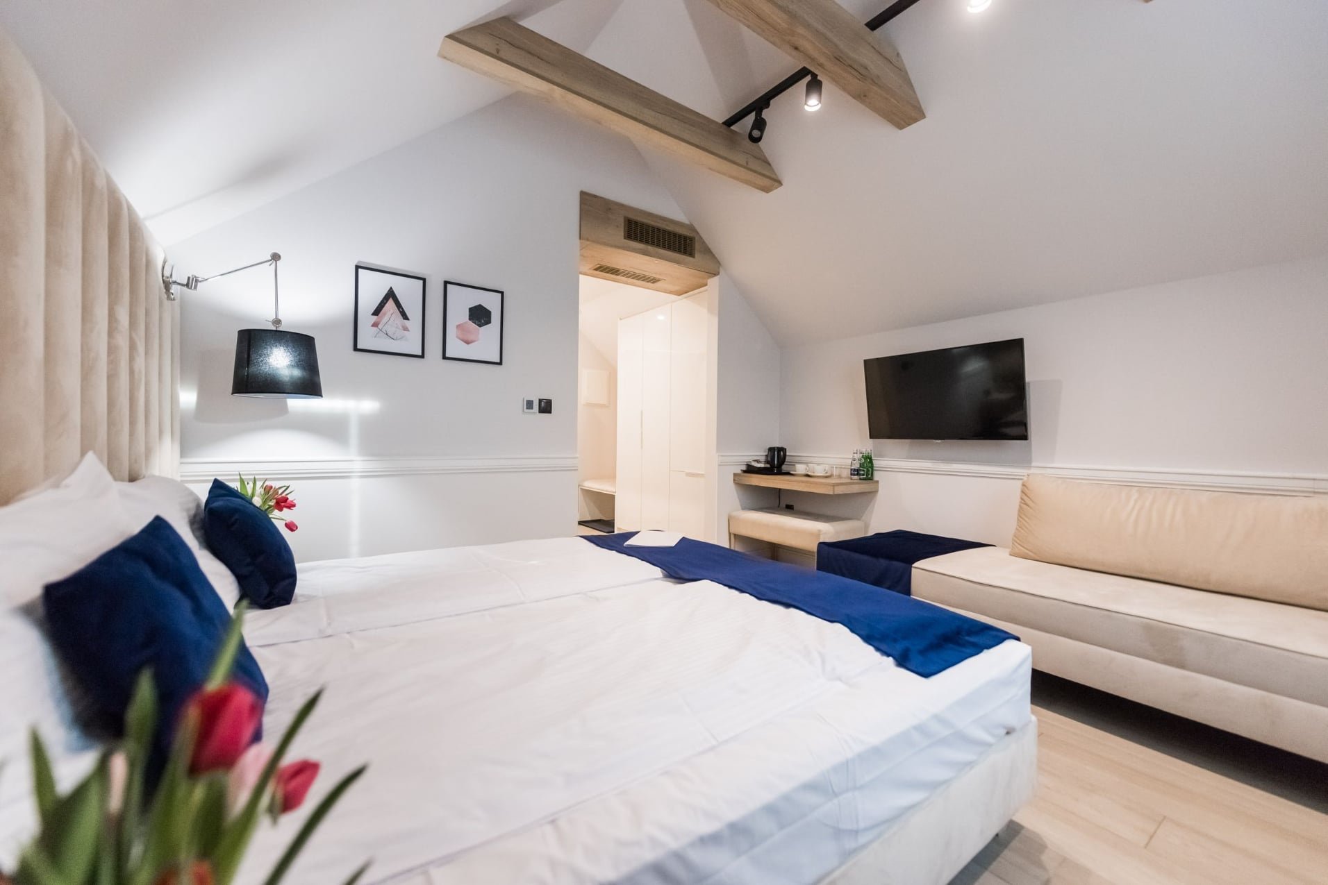 Poddasze — przytulny pokój hotelowy z pochylonym sufitem i drewnianymi belkami, dużym łóżkiem, granatowymi poduszkami, sofą, TV i czajnikiem