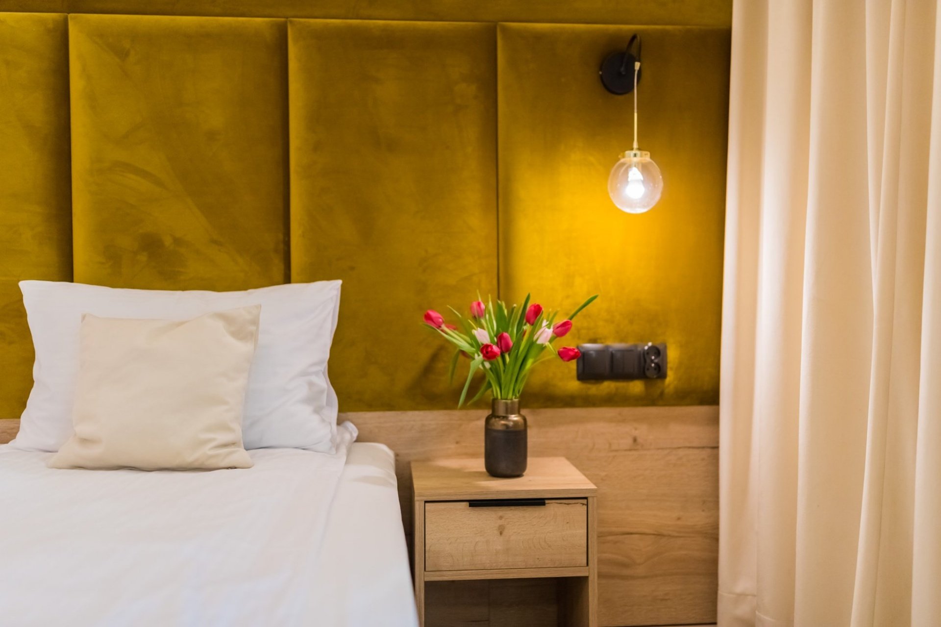 Łóżko z miękkim musztardowym welurowym zagłówkiem, białą pościelą, stolikiem nocnym z wazonem tulipanów i wiszącą szklaną lampą