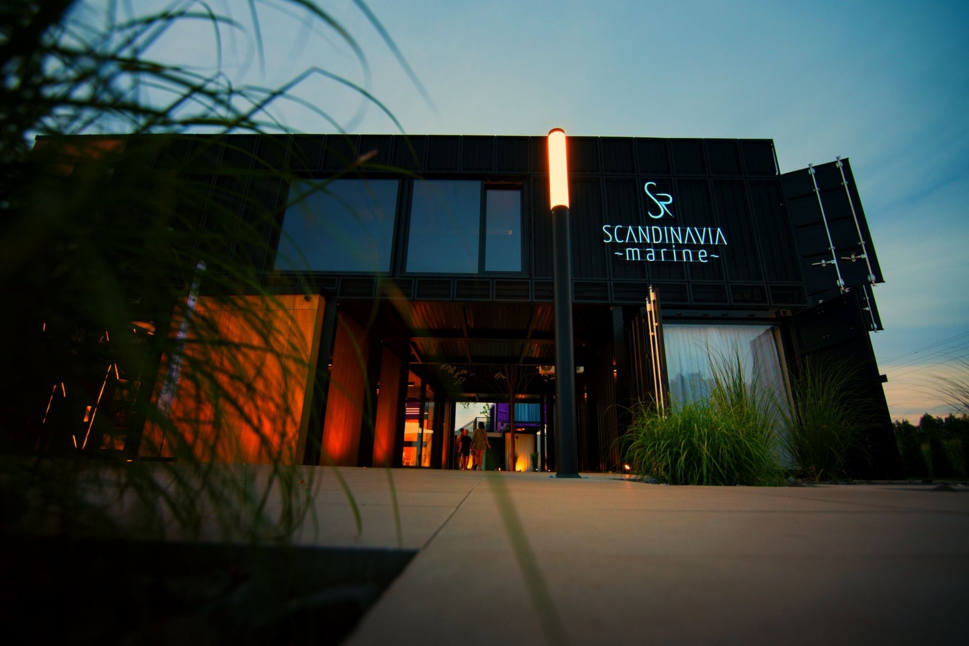 Wejście butikowego hotelu w czarnej kontenerowej bryle, neon 'Scandinavia Marine', oświetlony podjazd i dwaj goście o zmierzchu