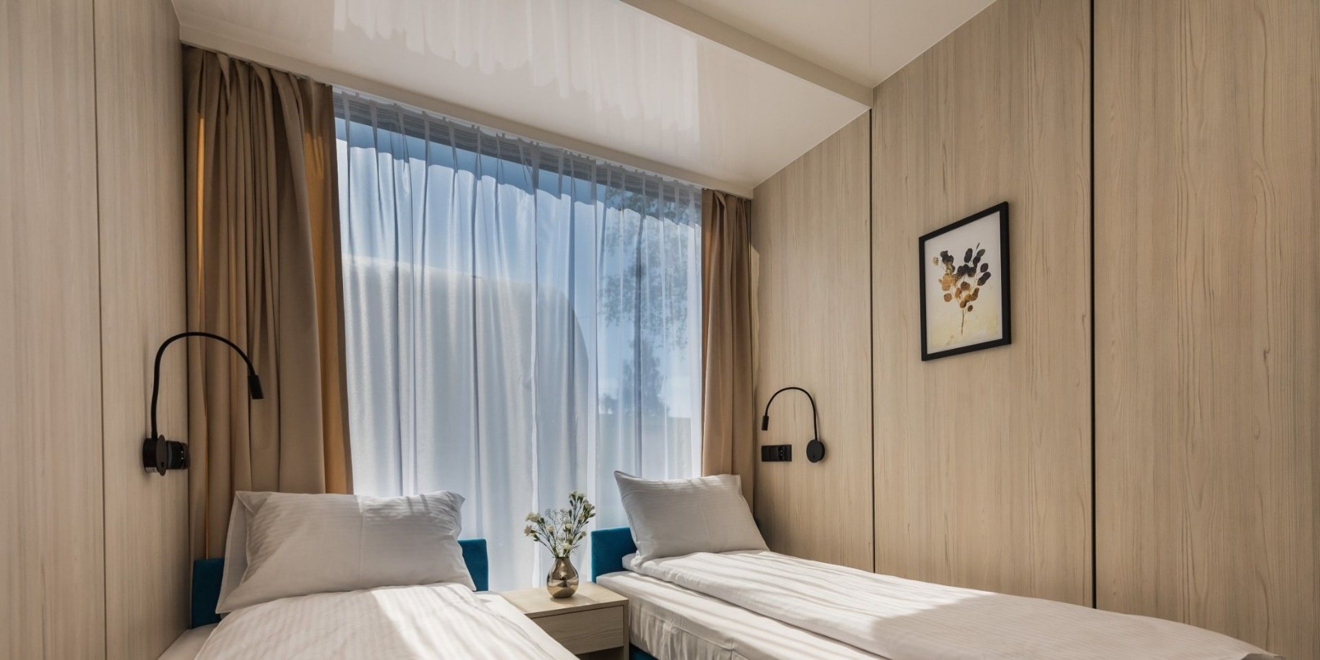 Nowoczesny pokój z drewnianymi panelami, dwiema pojedynczymi łóżkami, białą pościelą, stolikiem z wazonem, lampkami i naturalnym światłem