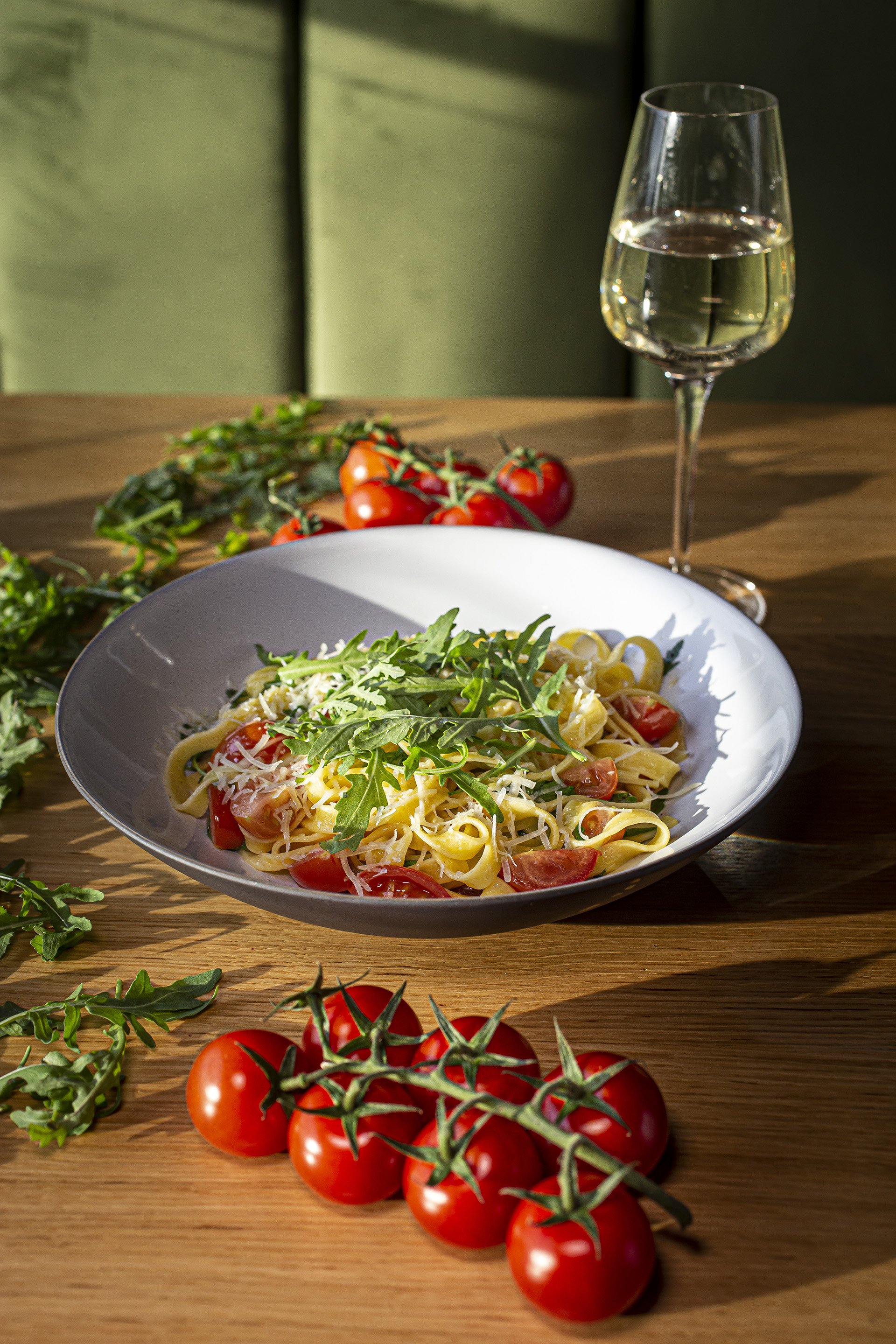 Tagliatelle z pomidorkami koktajlowymi, rukolą i parmezanem w białej misce, gałązka pomidorów i kieliszek białego wina na słonecznym stole