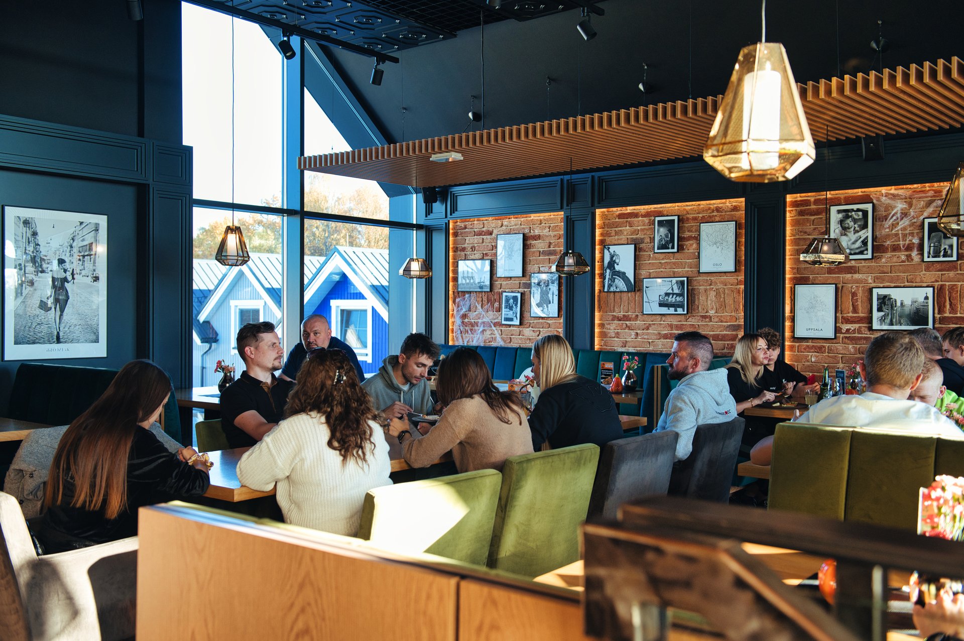 Przytulna restauracja hotelowa z ceglaną ścianą, drewnianym lamelowym sufitem, wiszącymi lampami, dużymi oknami, zielonymi aksamitnymi sofami i gośćmi przy posiłkach.