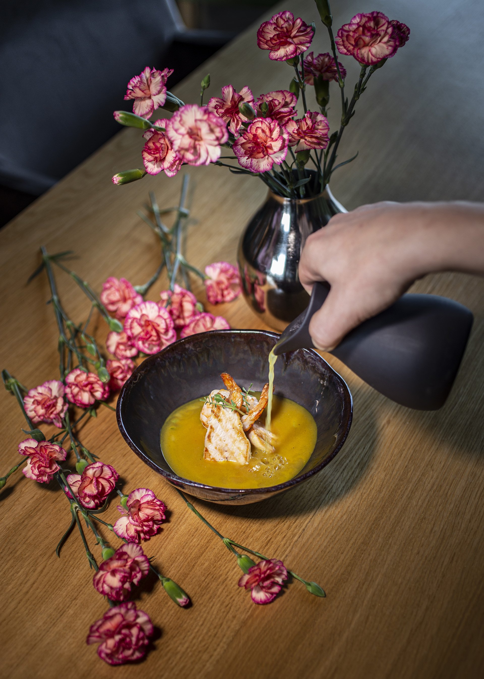 Elegancka miska z podsmażonymi owocami morza i krewetkami w złotym bulionie, dłoń dolewa sos; różowe goździki w wazonie na drewnianym stole.