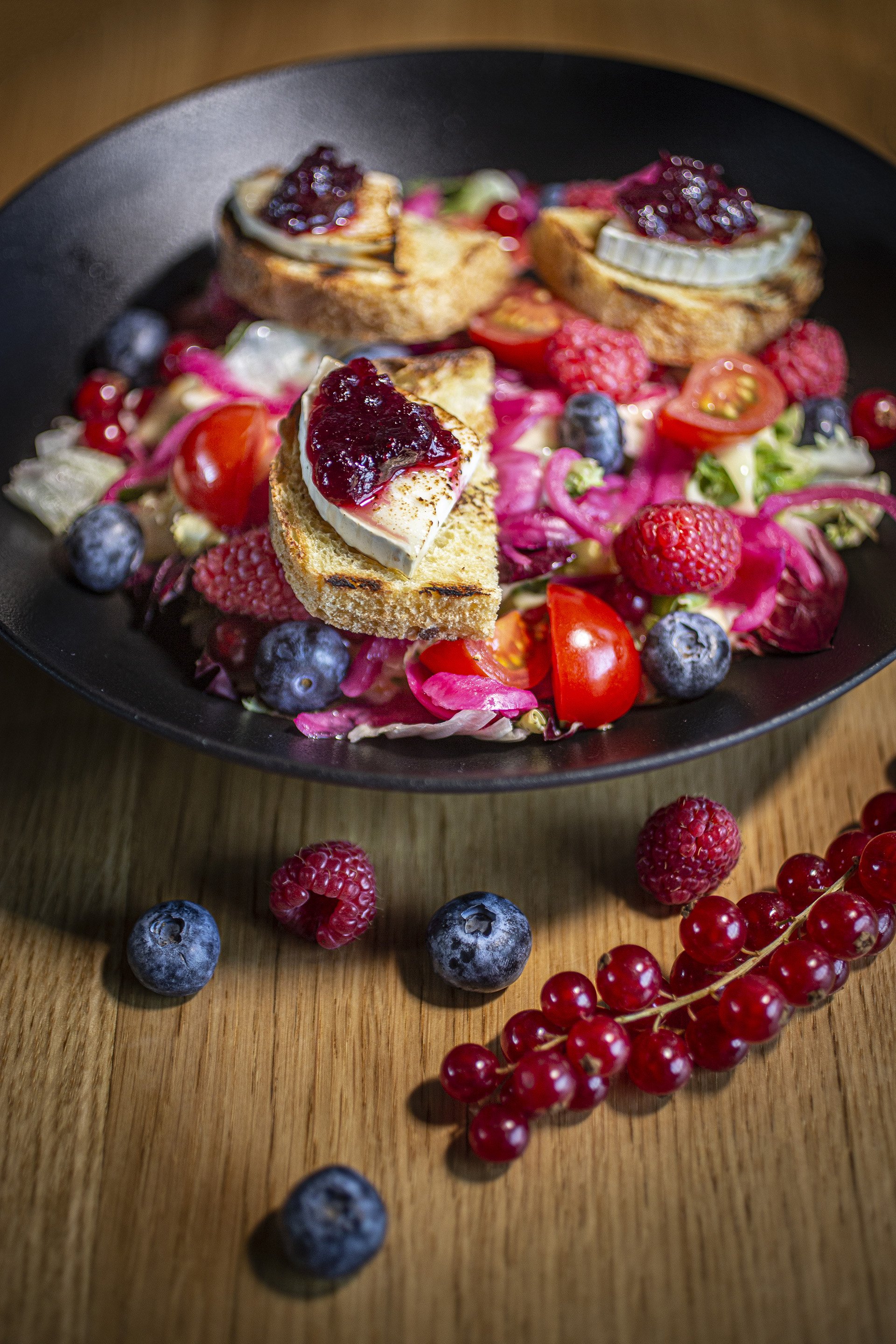 Grillowany kozi ser na crostini z dżemem jagodowym na mieszanej sałatce, maliny i borówki rozsypane na drewnianym stole