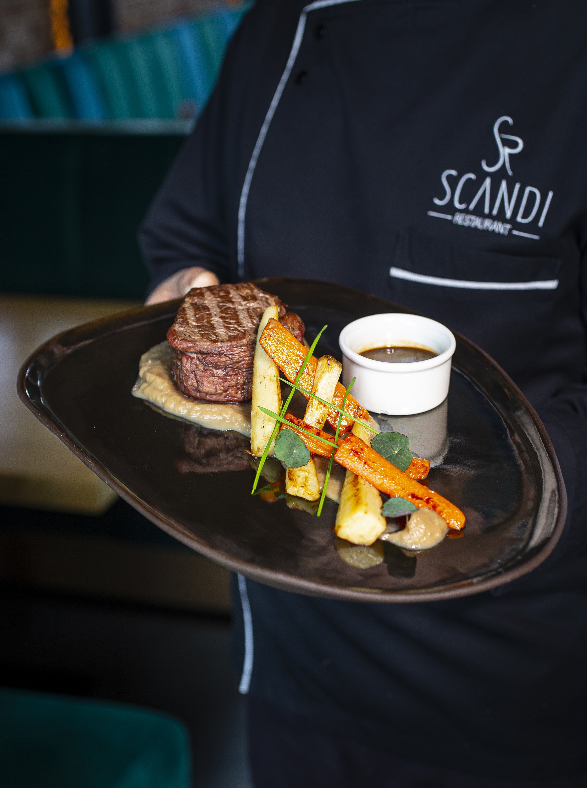 Kelner podaje grillowaną polędwicę na purée z pieczonymi warzywami korzeniowymi, mikrozieleniną i sosem na czarnym talerzu.