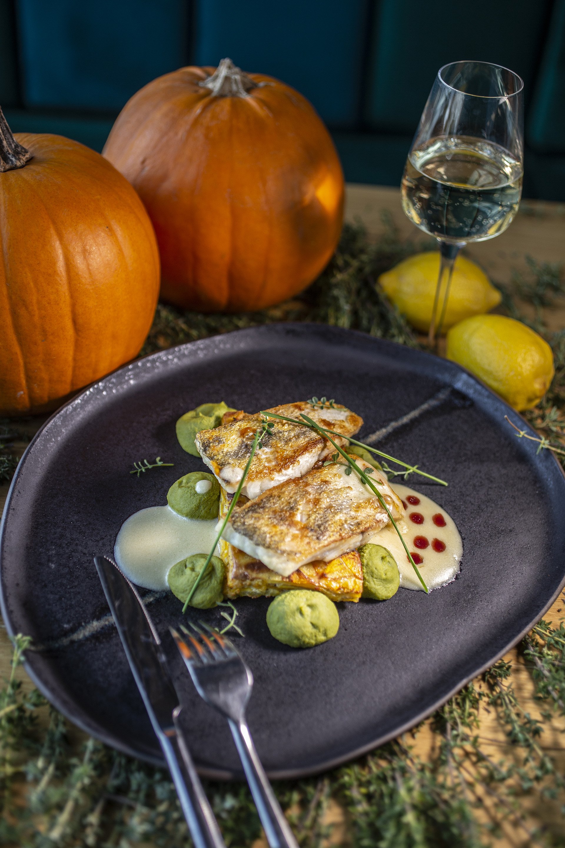 Smażona ryba na terrinie z dyni z puree z groszku, kremowym sosem i ziołami na ciemnym talerzu; kieliszek wina, cytryny i dynie