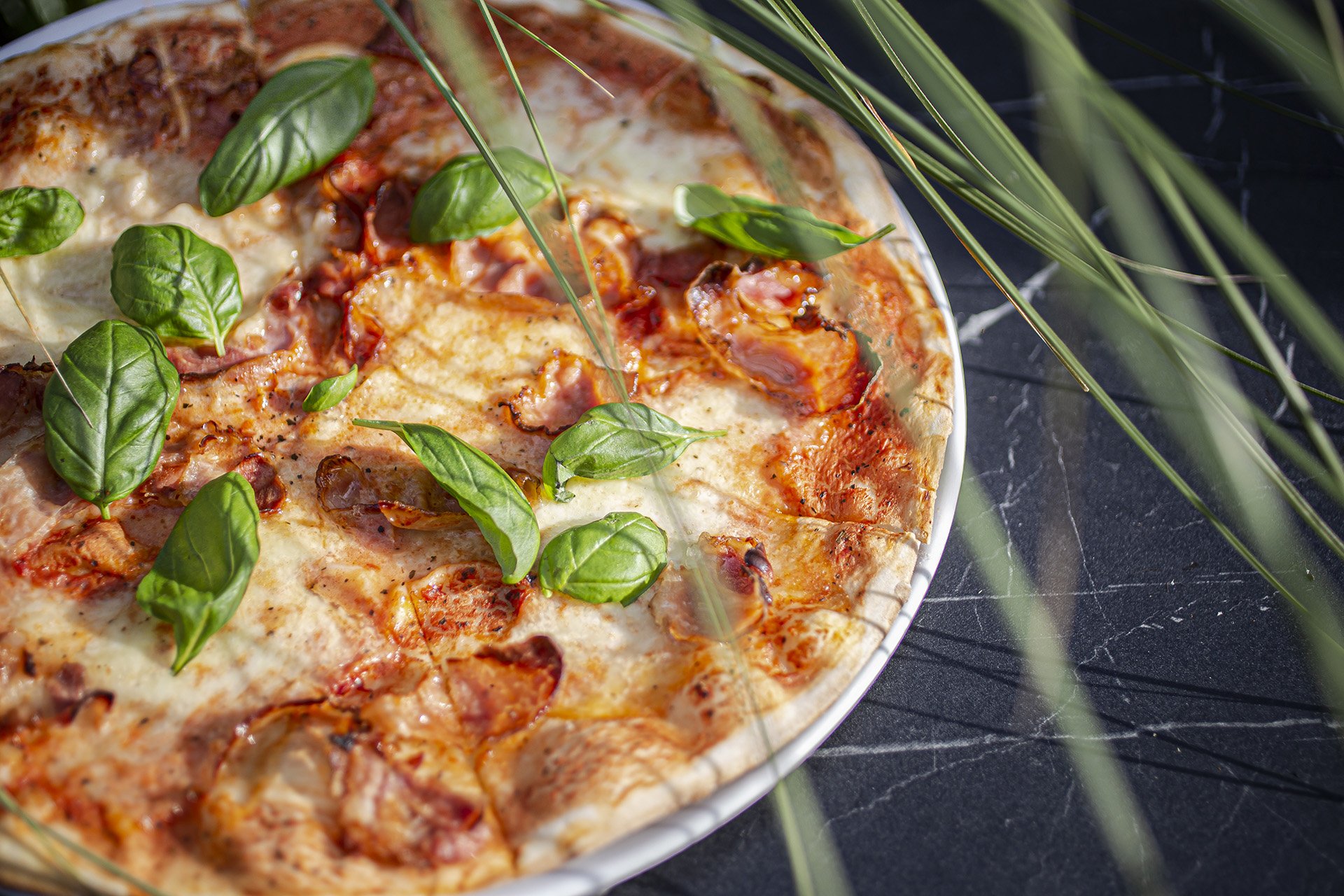 Pizza na cienkim cieście z roztopioną mozzarellą, złocistymi przypieczonymi brzegami i świeżą bazylią na białym talerzu.