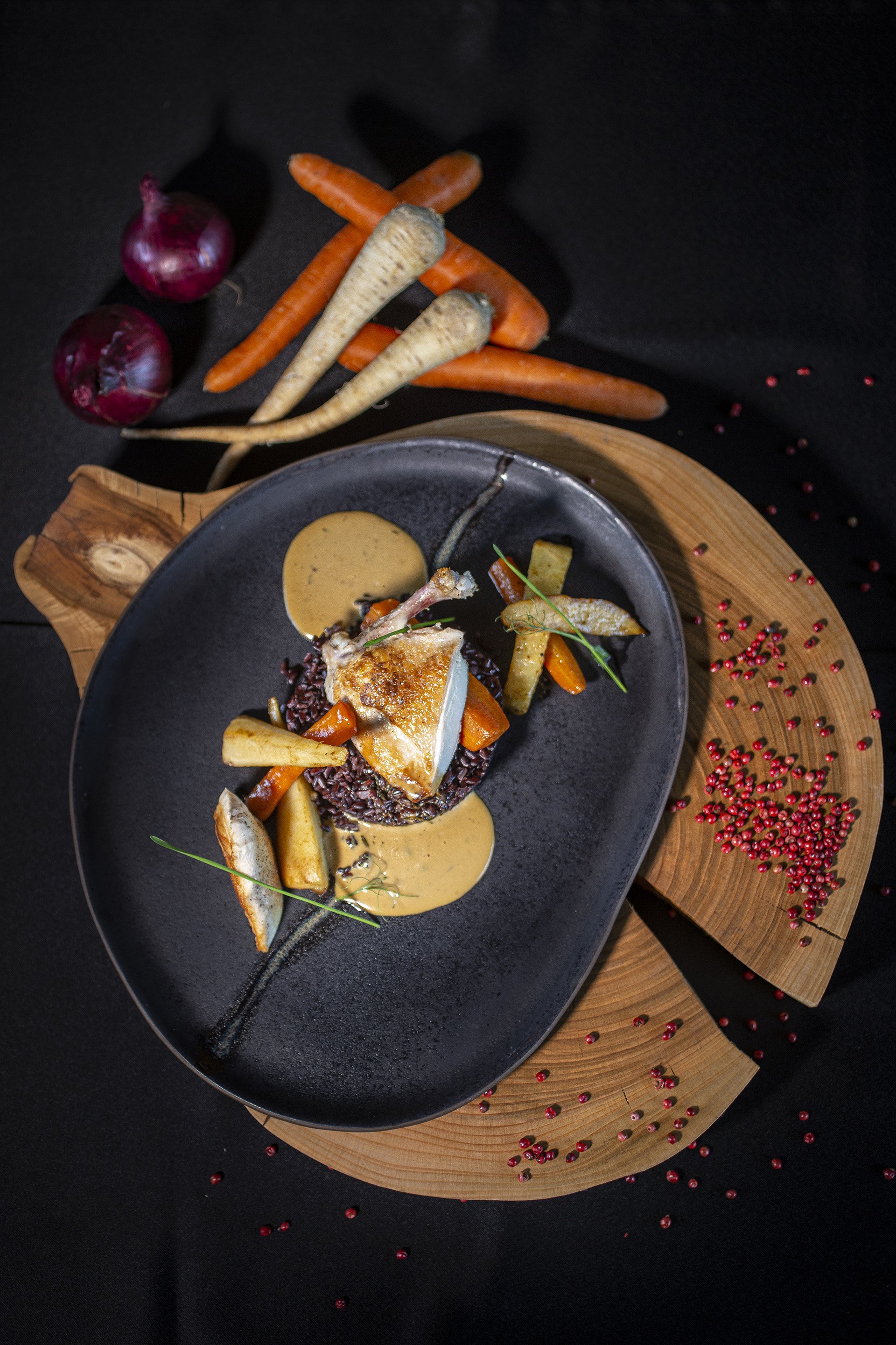 Pieczony kurczak na czarnym ryżu z glazurowanymi marchewkami, pasternakami i kremowym sosem na czarnym talerzu na drewnianej desce z różowym pieprzem