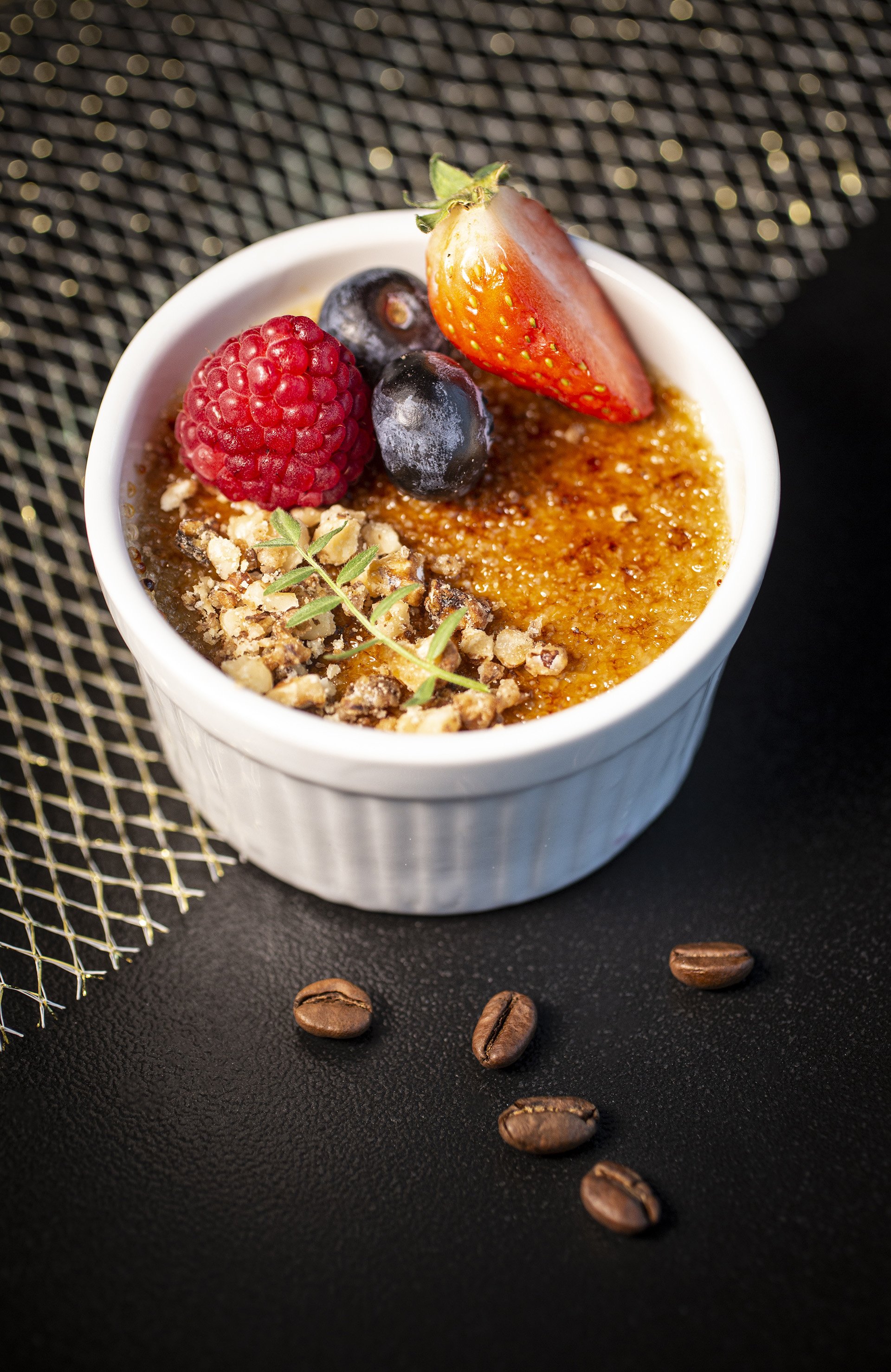 Krem brulee w białej kokilce ze skarmelizowaną skorupką, maliną, borówką, połówką truskawki, kruszonymi orzechami i tymiankiem; ziarna kawy obok