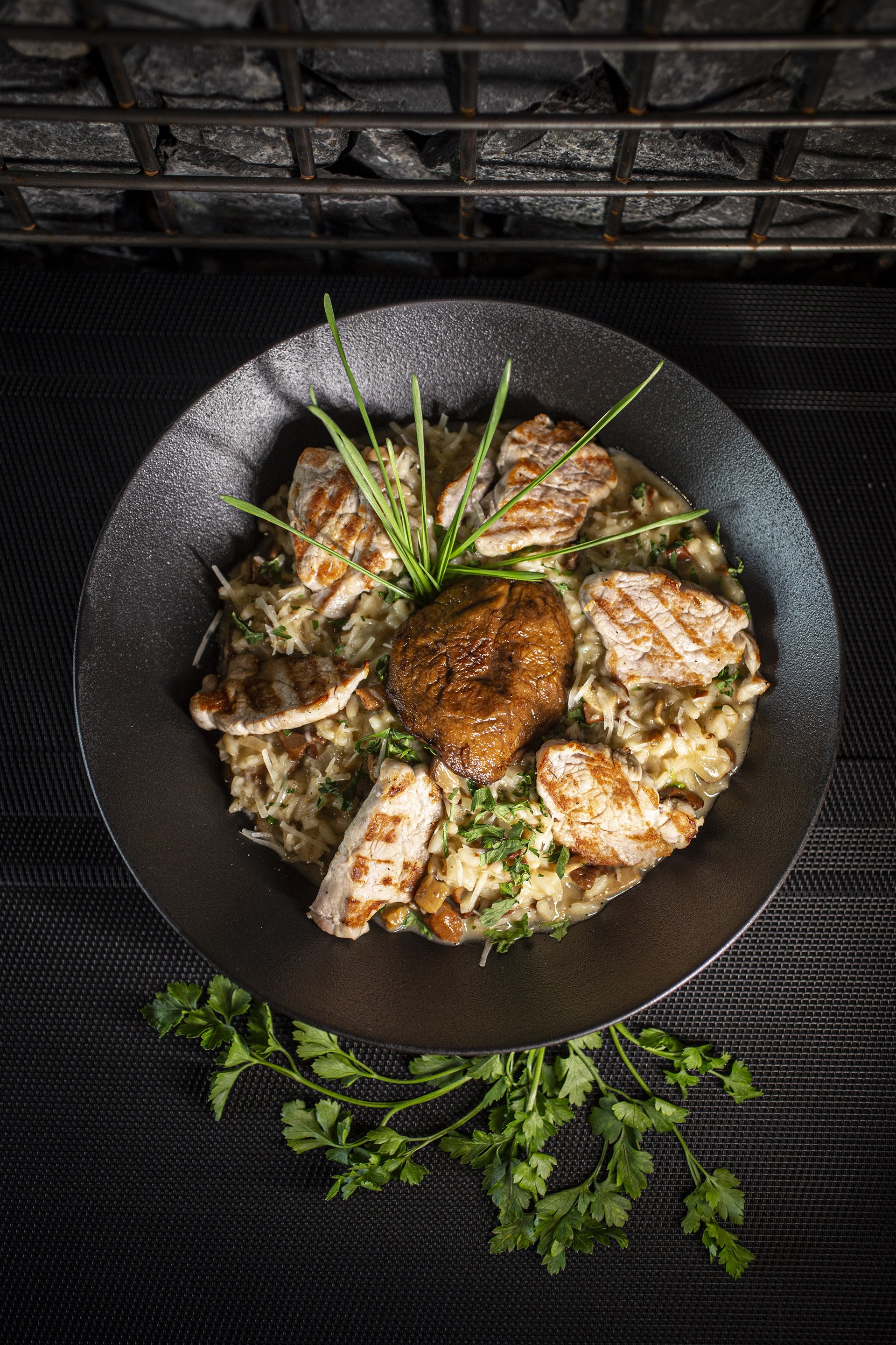 Kremowe risotto z grzybami podane z grillowanymi medalionami wieprzowiny i pieczonym portobello, ozdobione szczypiorkiem i natką pietruszki.