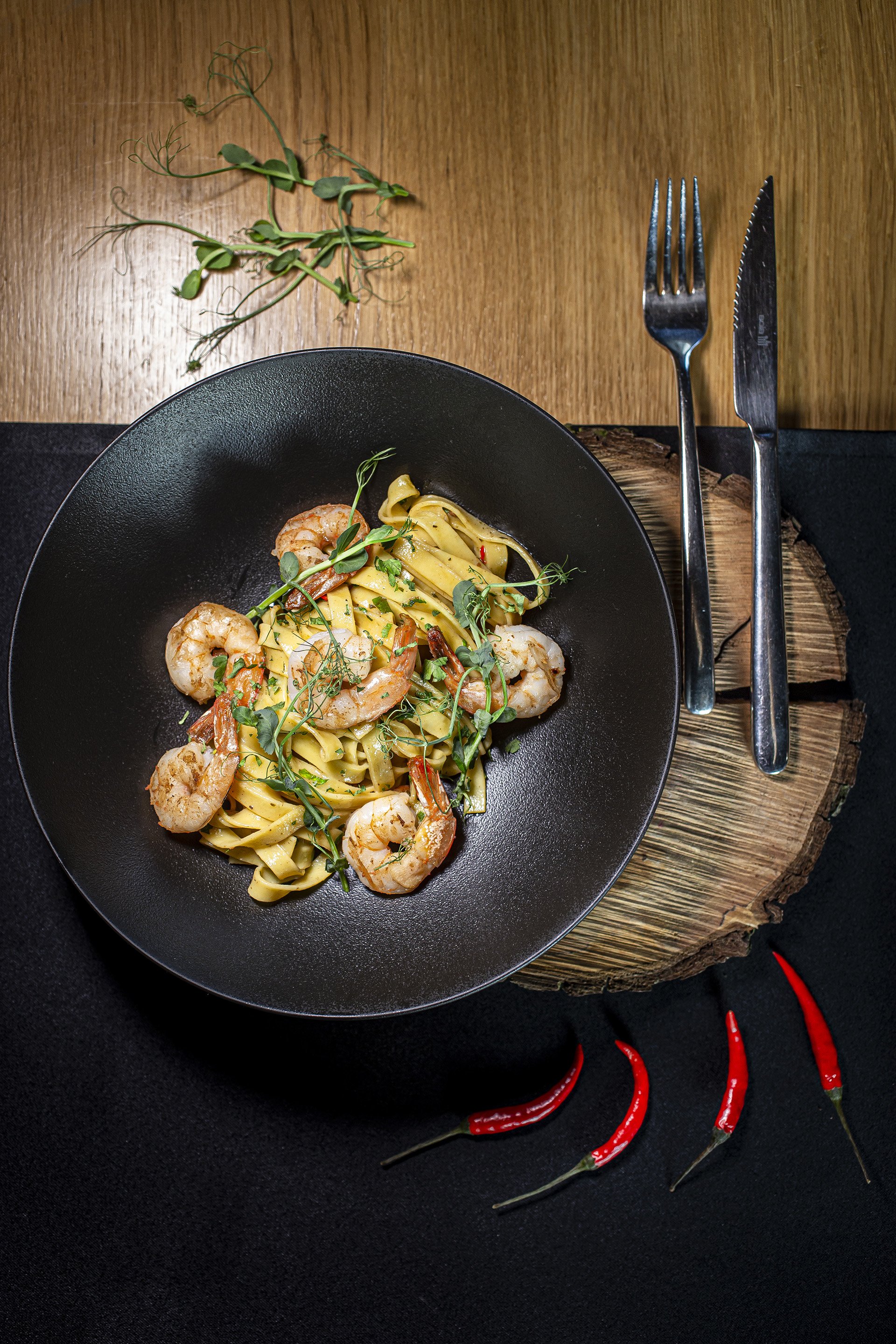Tagliatelle z krewetkami, ziołowymi kiełkami i papryczką chili, podane w czarnej misce na rustykalnej desce ze sztućcami