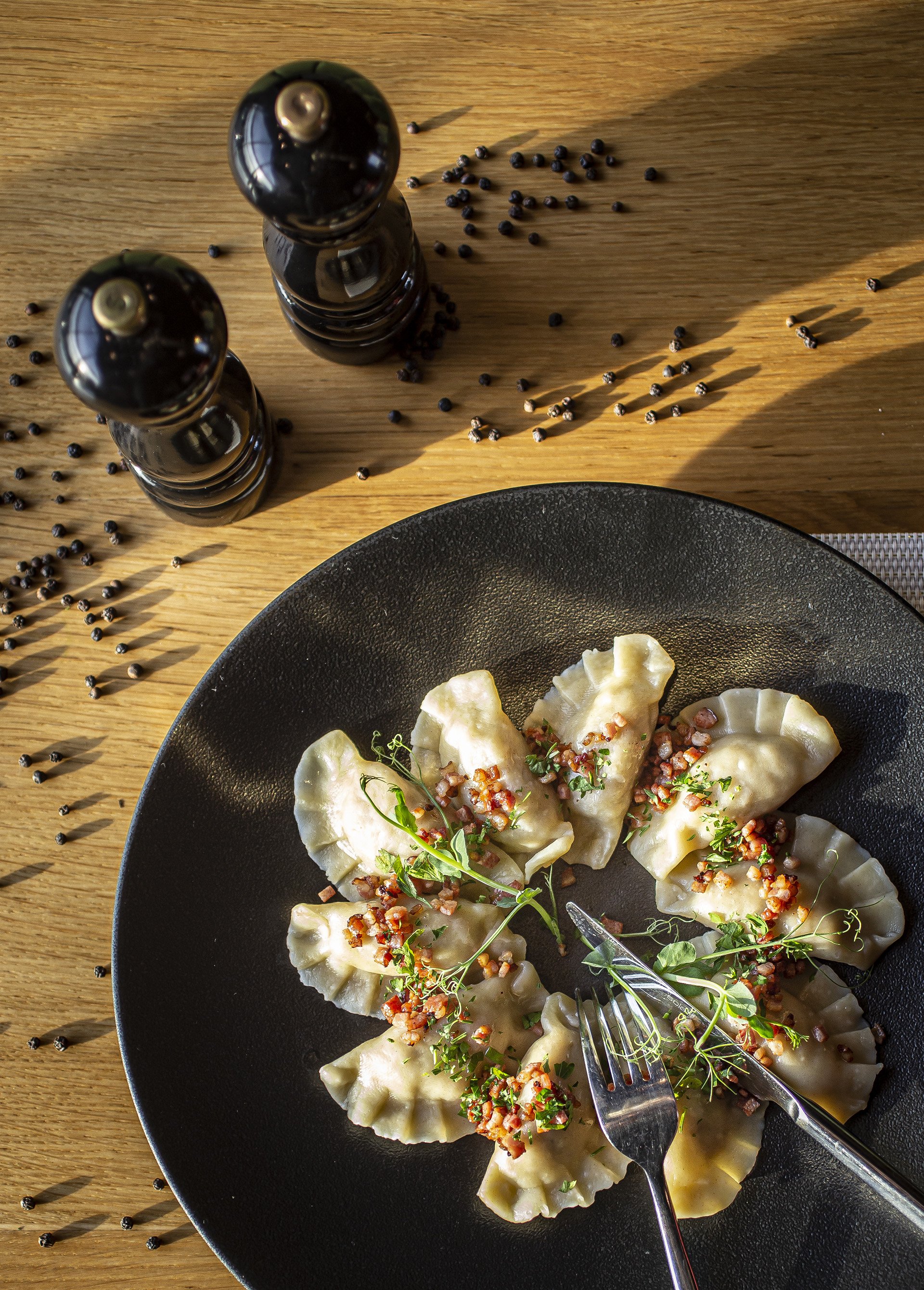Pierogi w półksiężycowym kształcie na czarnym talerzu, z chrupiącymi skwarkami i kiełkami; widelec i nóż, młynki do pieprzu na drewnianym stole.