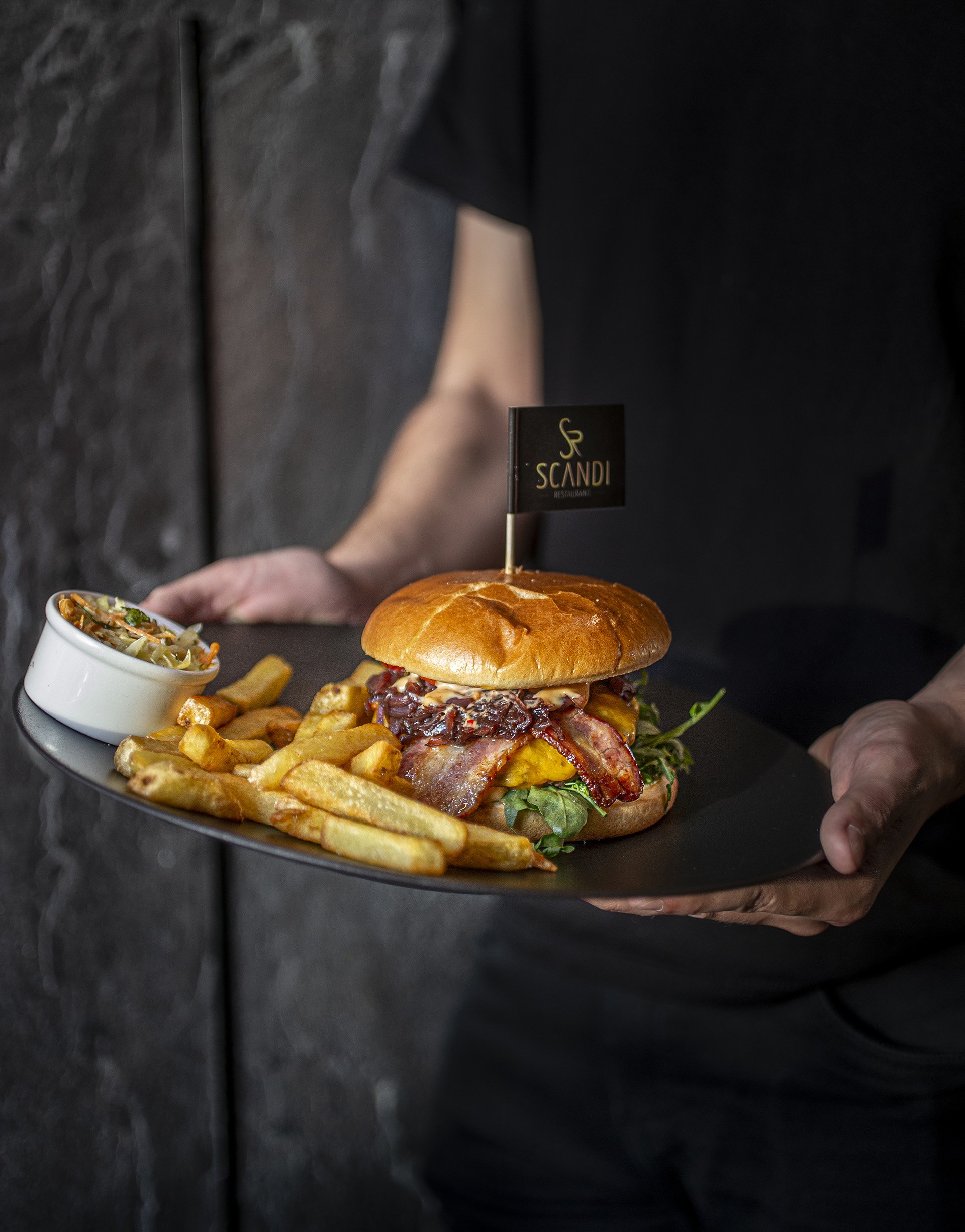 Burger z boczkiem i serem, świeże liście, frytki i colesław na czarnej tacy, mała flaga „Scandi”, podany przez obsługę